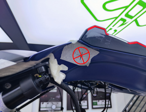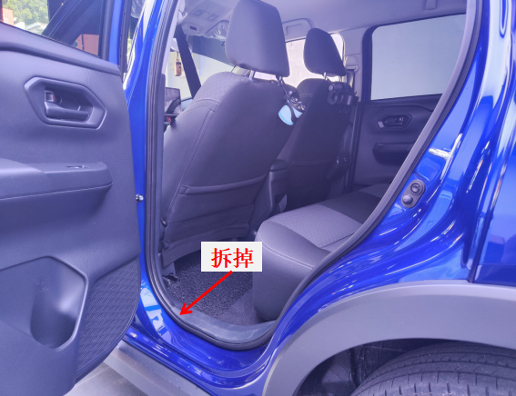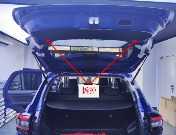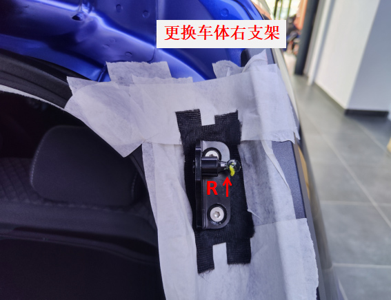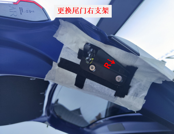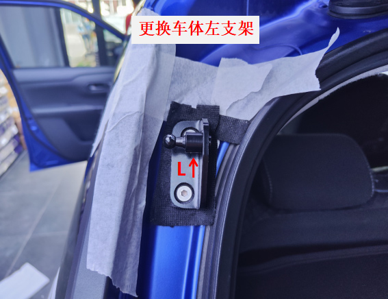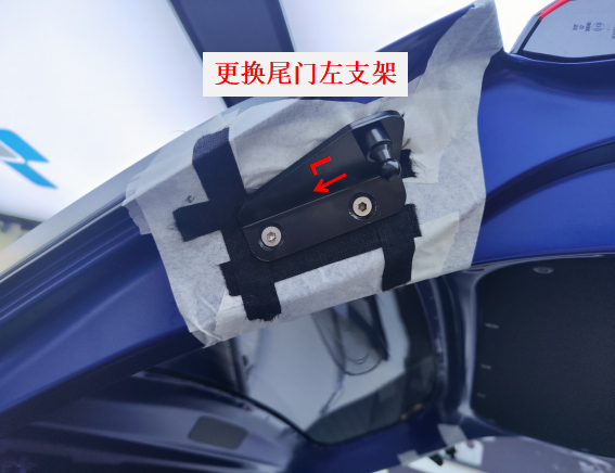 8、更换尾门左支架(支架贴纸箭头指向合页铰链,左右一样)。