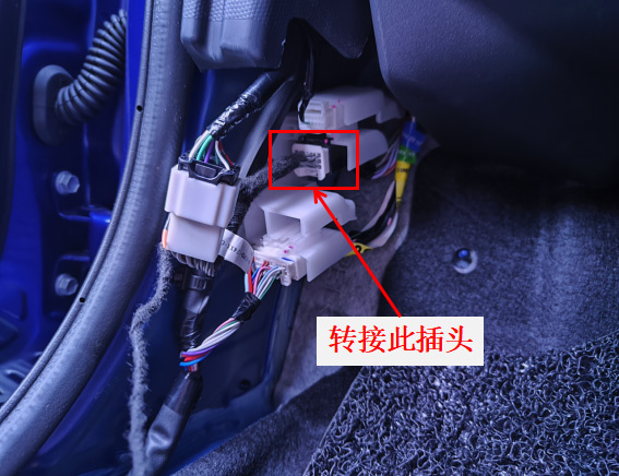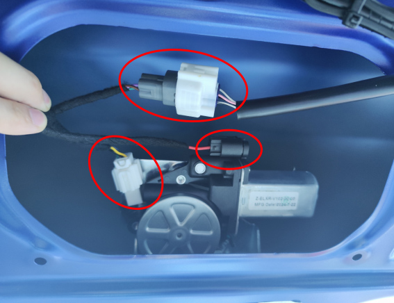 ● 部分线束的端子在出厂时尚未插胶壳(如下图红色圈内的端子) ,布好线束后为了避免端子碰在一起短路,穿完线束后需先插胶壳,再将线束其它插头(如下图蓝色圈内的插头)与原车插头对插;