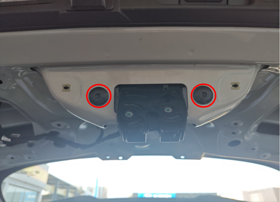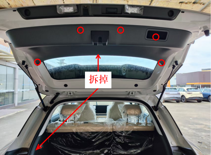 3、拆掉尾门饰板和尾箱左侧饰板(注意圆圈位置有螺钉)。
