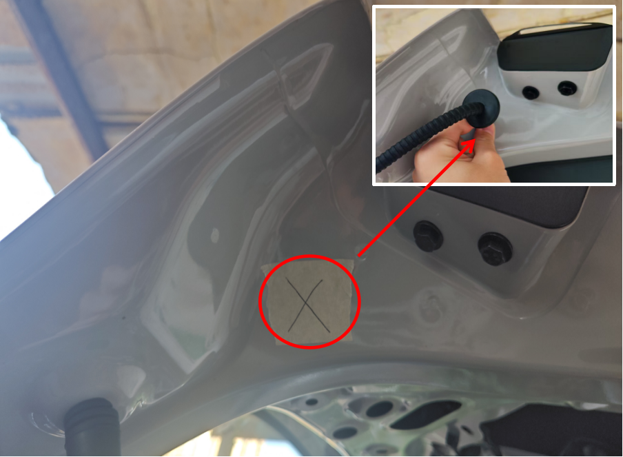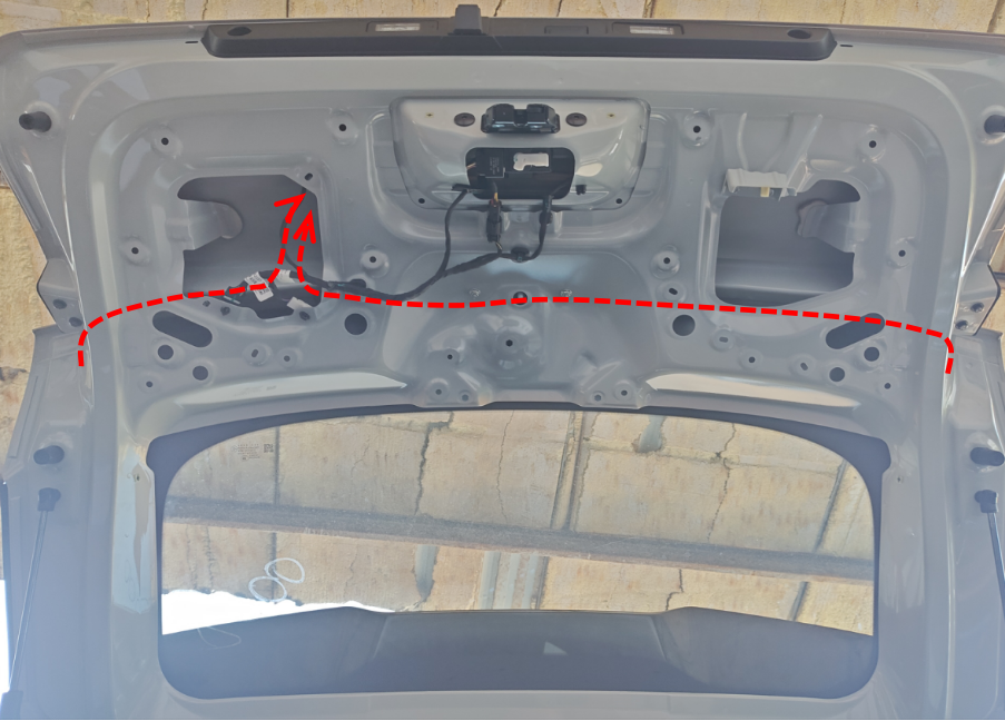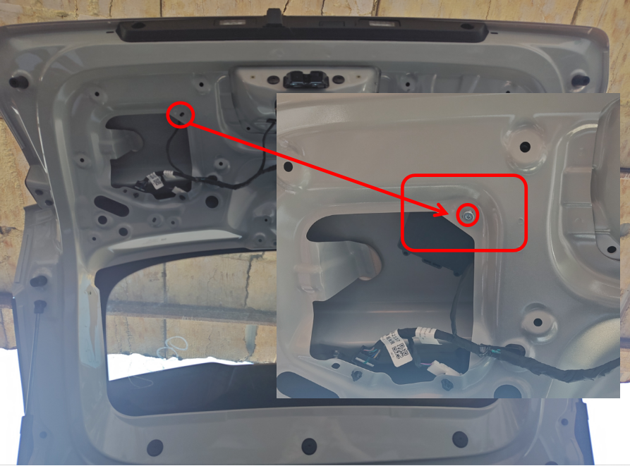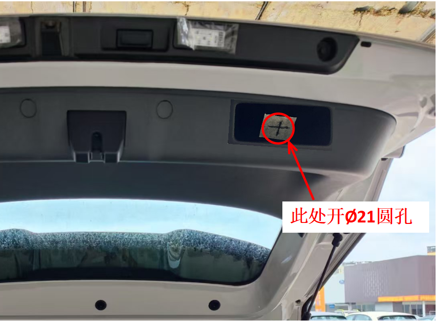 8、尾门图示位置用配件里的开孔器打孔,进撑杆线并塞好胶塞,左右一样,(注意避开焊点)。