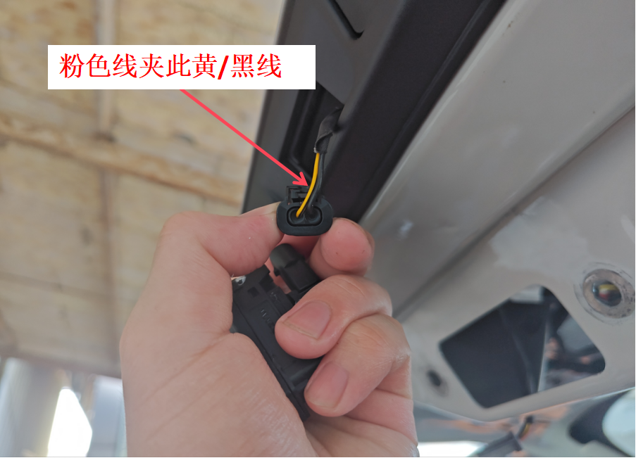 11、先把锁线上的粉色信号线夹到原车外按键对插黄/黑色线上。