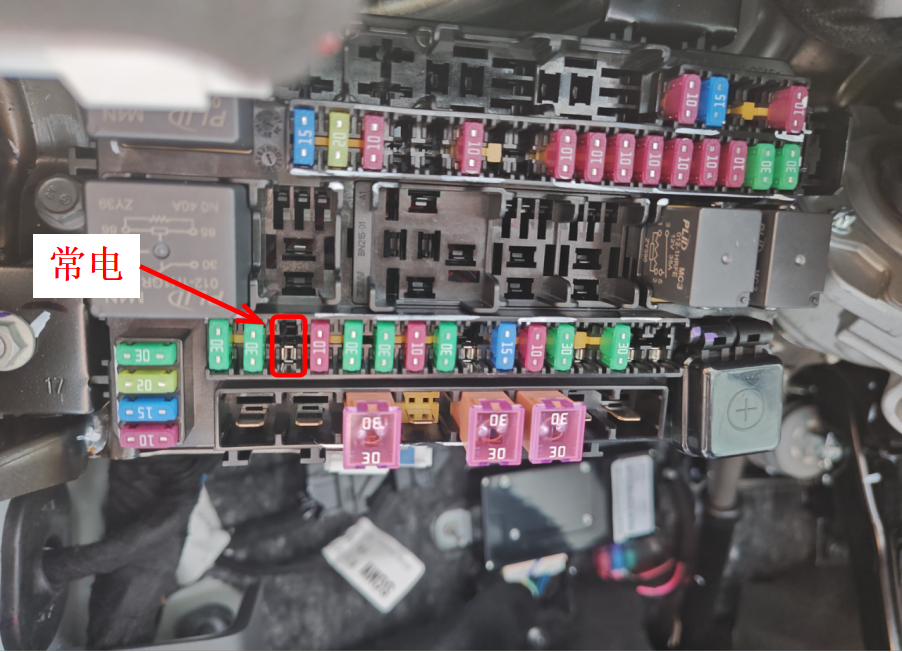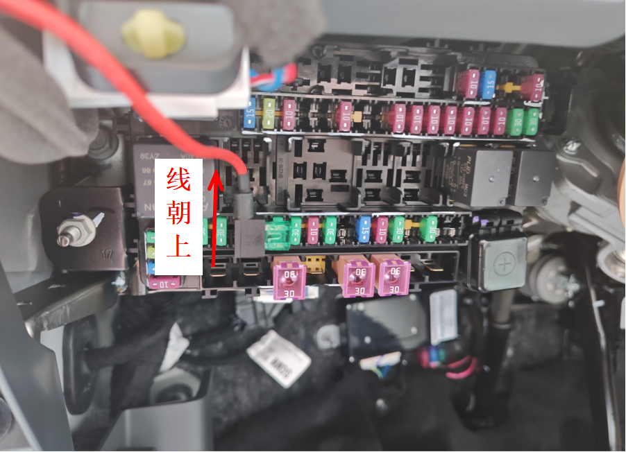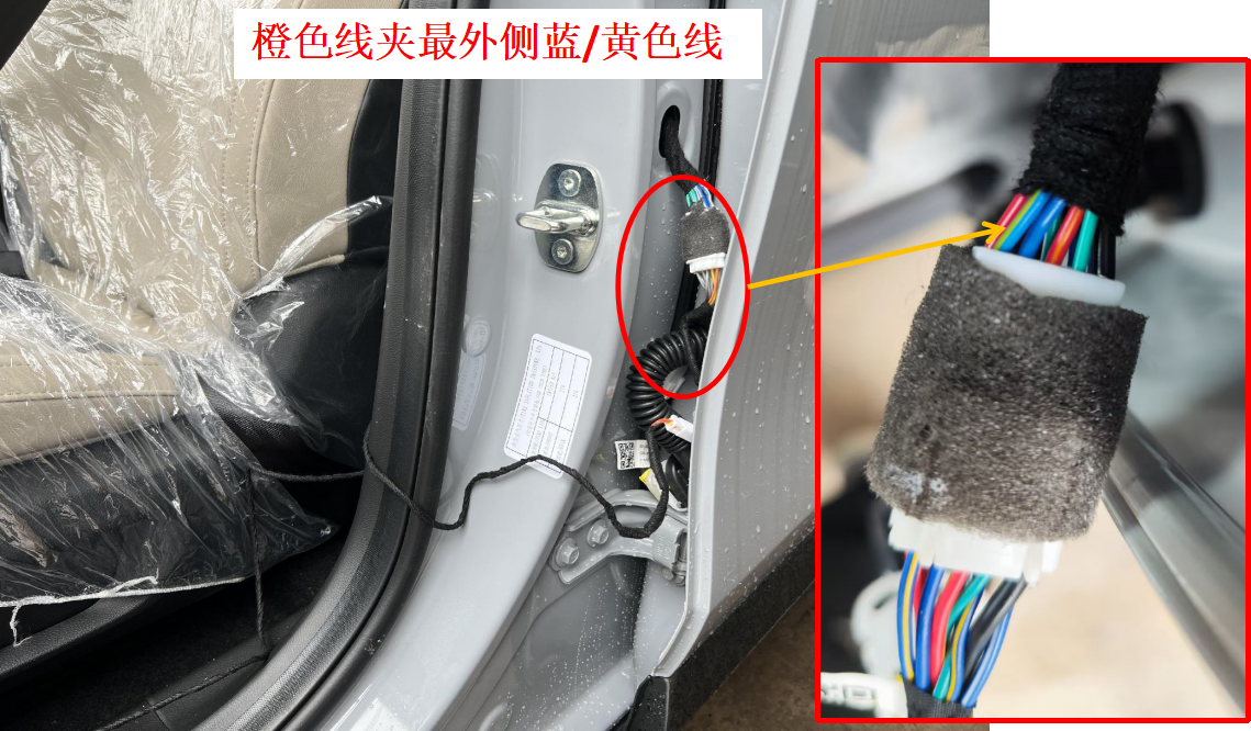 18、B柱位置找到胶壳,将电源线上的橙色信号线夹原车对插最外侧蓝/黄色线。