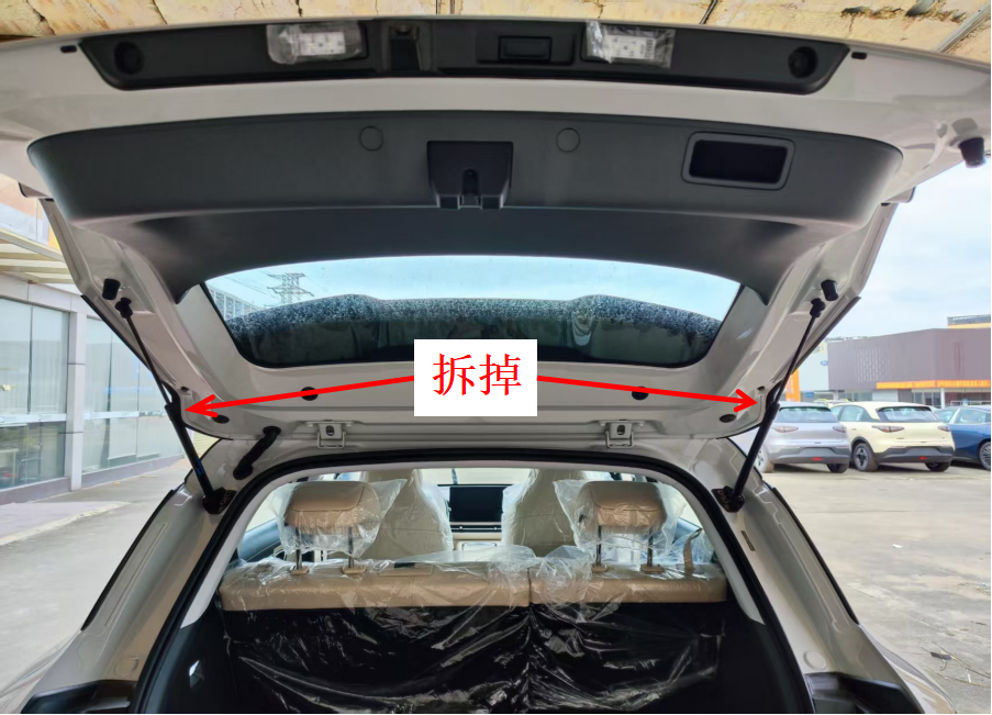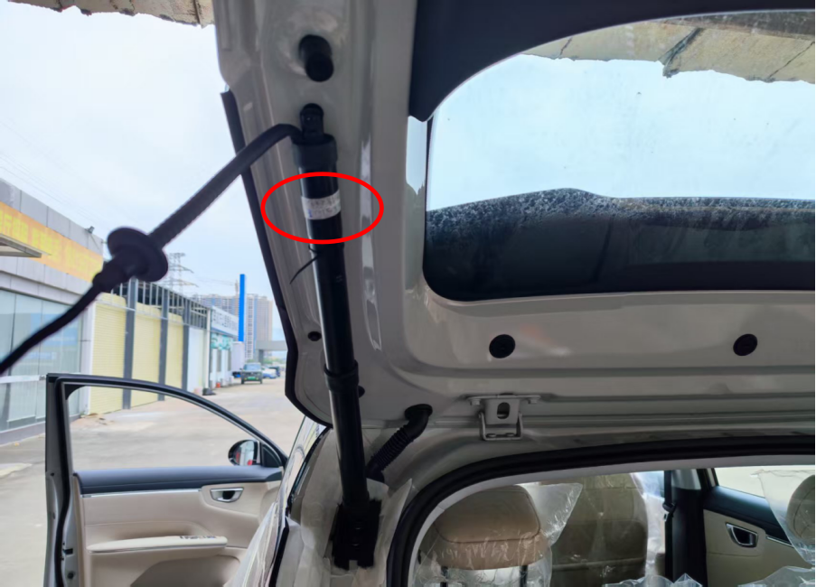 7、安装电动撑杆,L在左,R在右(撑杆编码的第一个字母),撑杆带线的一端安装在尾门,左右一样。
