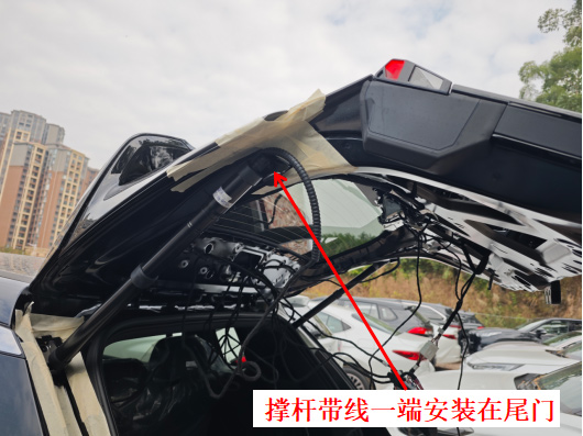 10、安装电动撑杆,L在左,R在右(撑杆编码的第一个字母),撑杆带线的一端安装在尾门,左右一样。