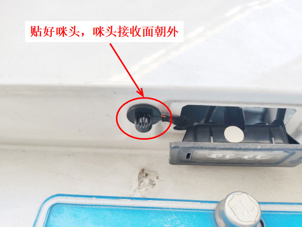 5、撕开外咪头背胶,用牌照灯压住咪头的边缘,贴好咪头,装回牌照灯,将线束压紧。